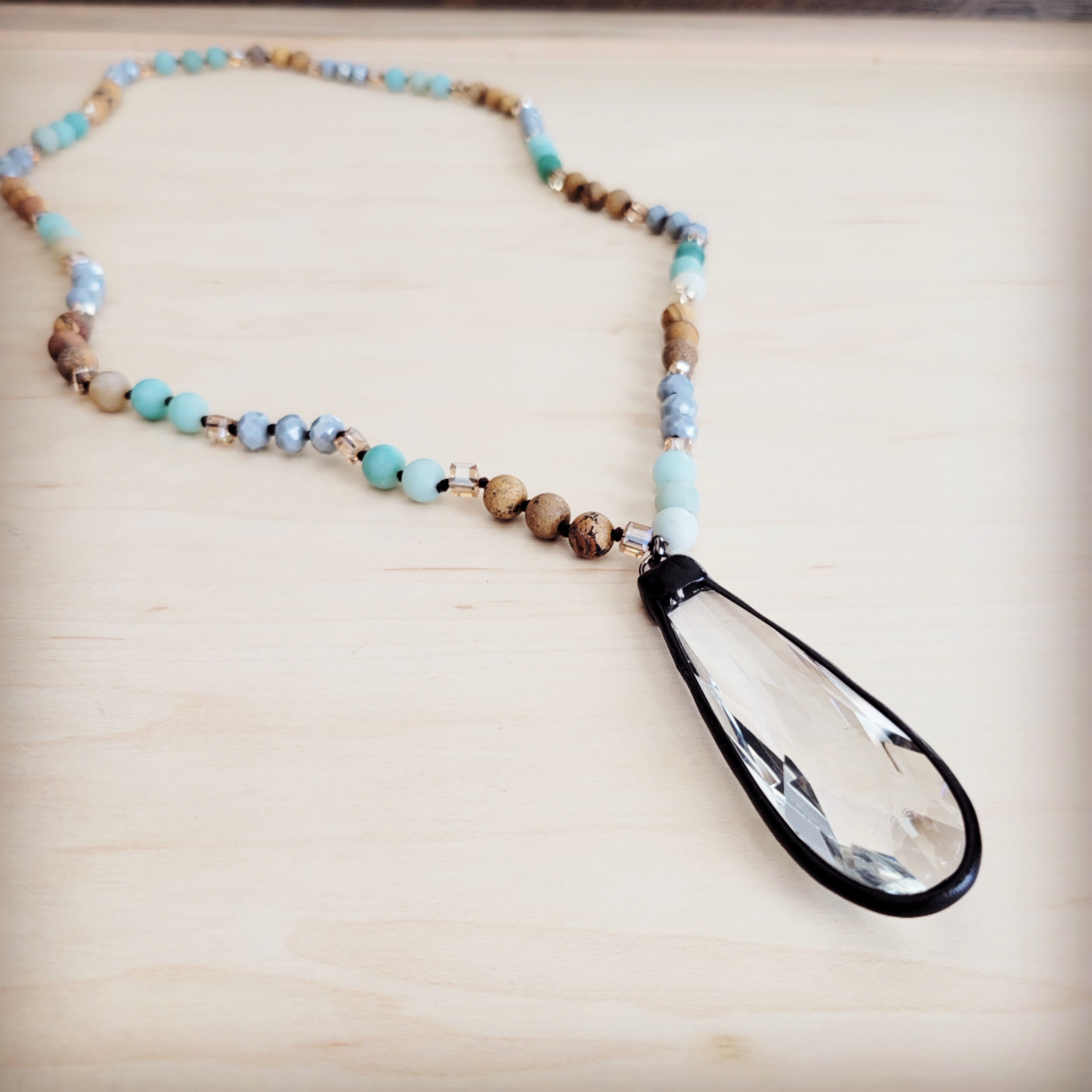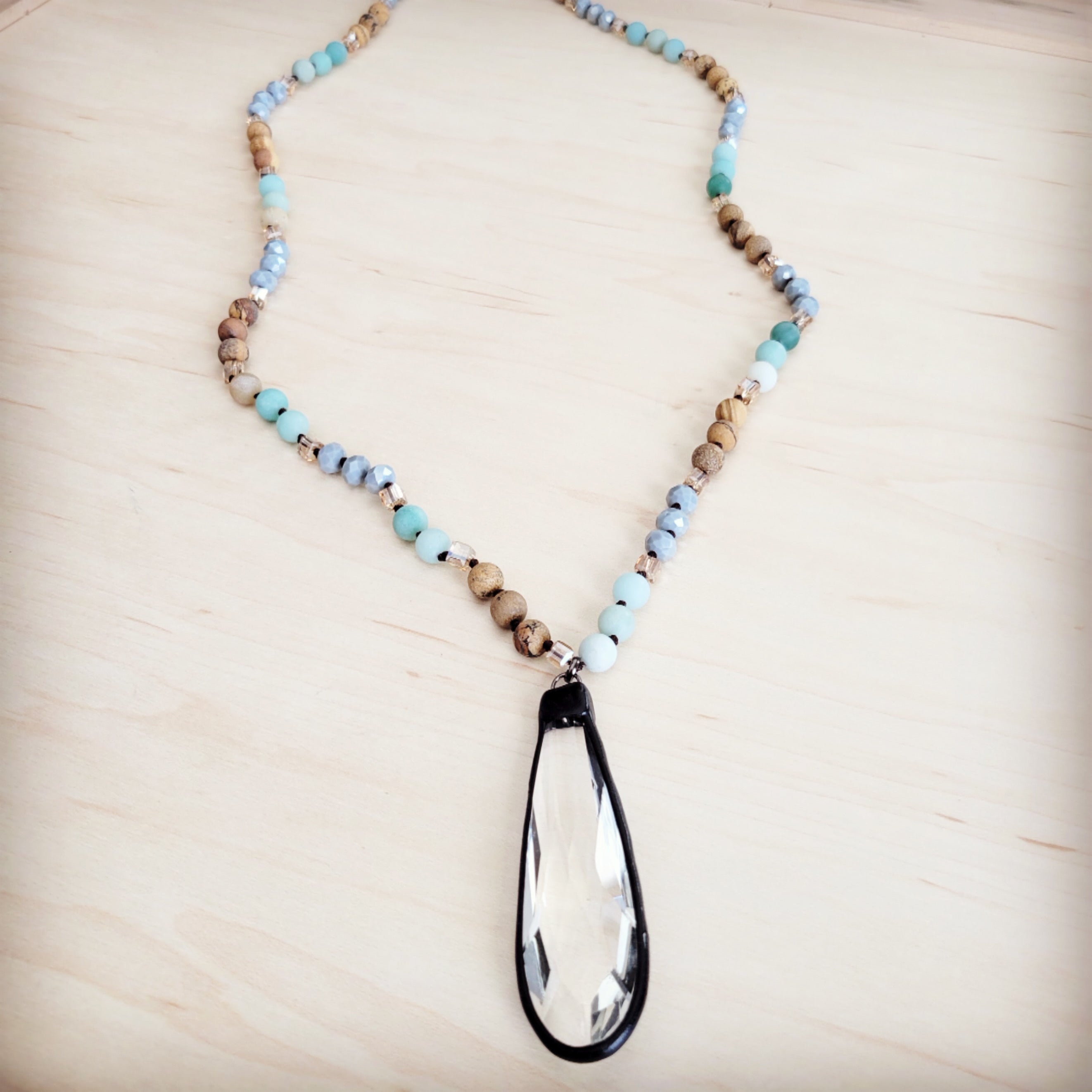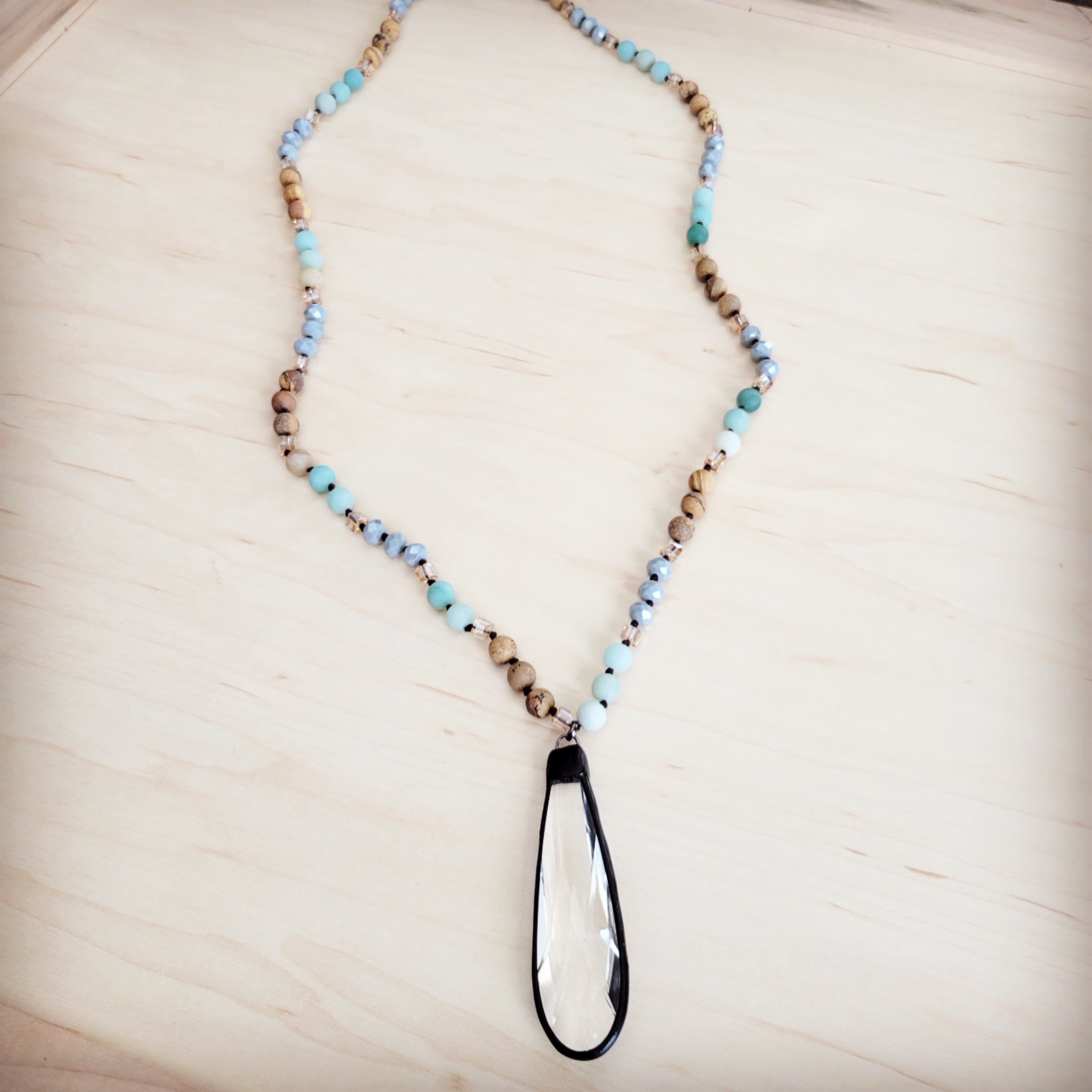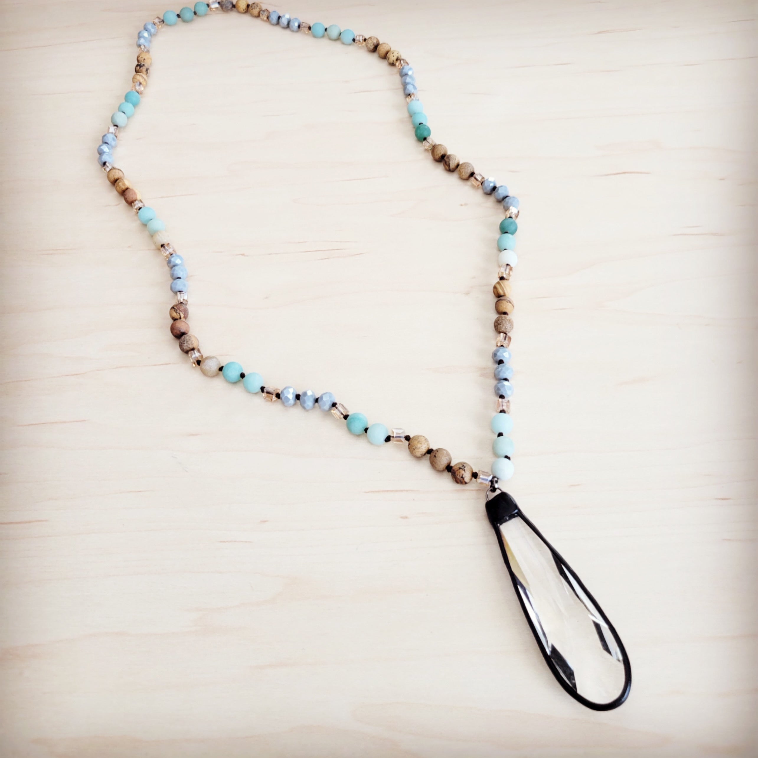 Picture Jasper & Amazonite Long Beaded Necklace w/ Crystal Pendant 262r