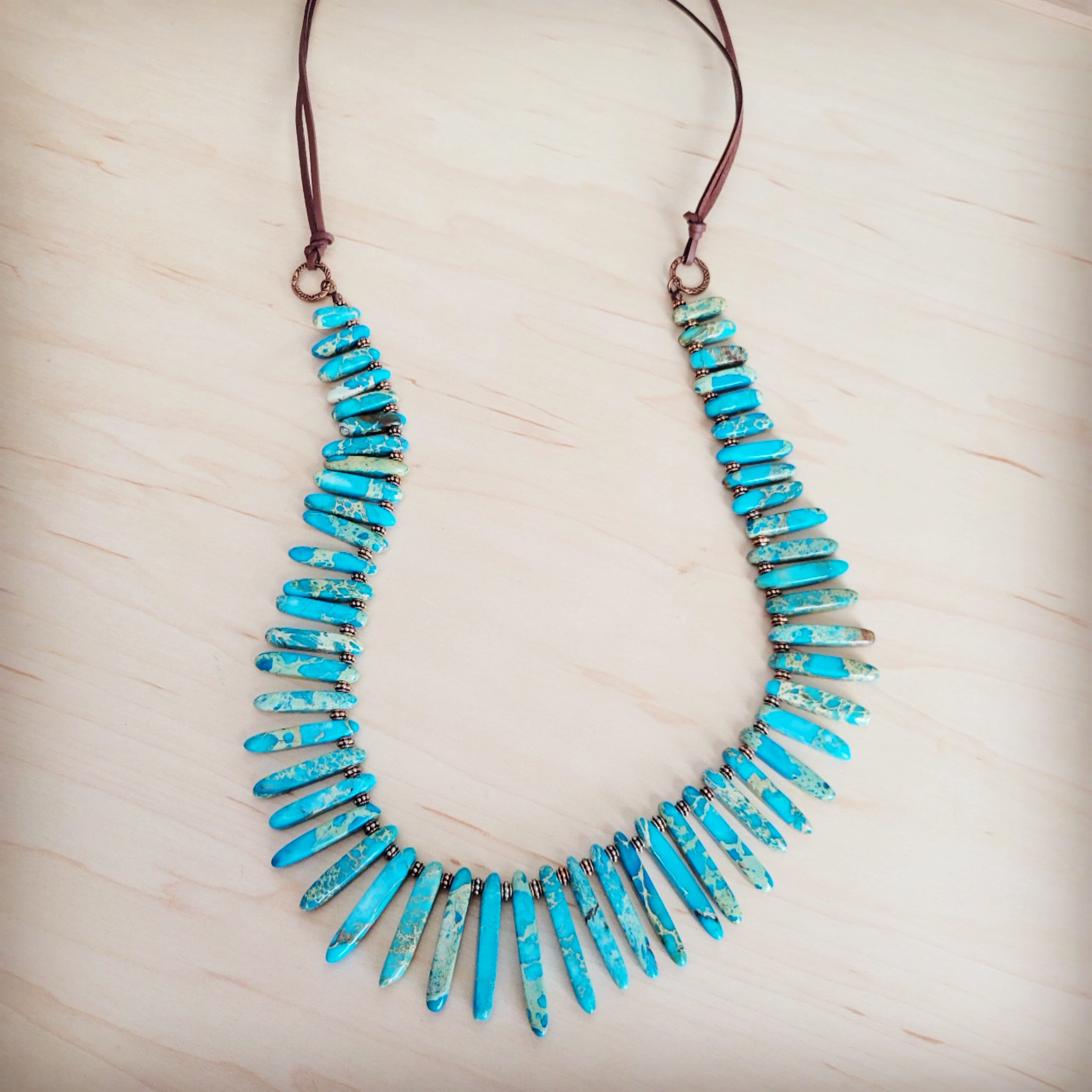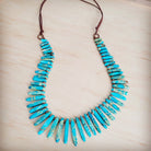 This striking necklace is a beautiful blend of natural style and boho statement.The piece features numerous polished, elongated turquoise-colored stone slabs that graduate in size, creating a dramatic, U-shaped bib silhouette. Each stone boasts a vibrant, medium-to-light sky-blue color, with natural brown or reddish-brown matrix adding authentic character and earthy appeal. The varying lengths of the slabs emphasize the handcrafted look. This is a powerful, organic piece perfect for a chic, free-spirited look.