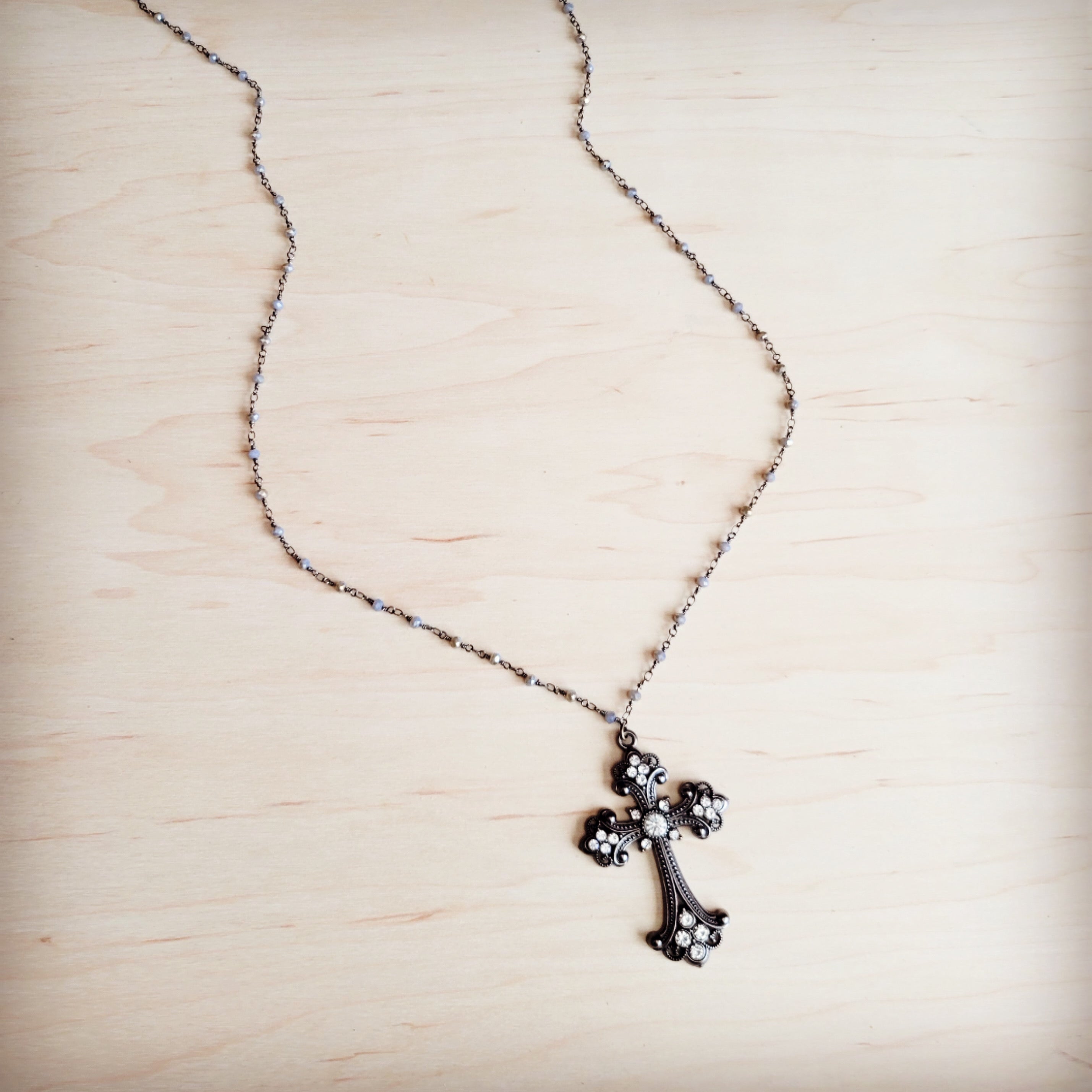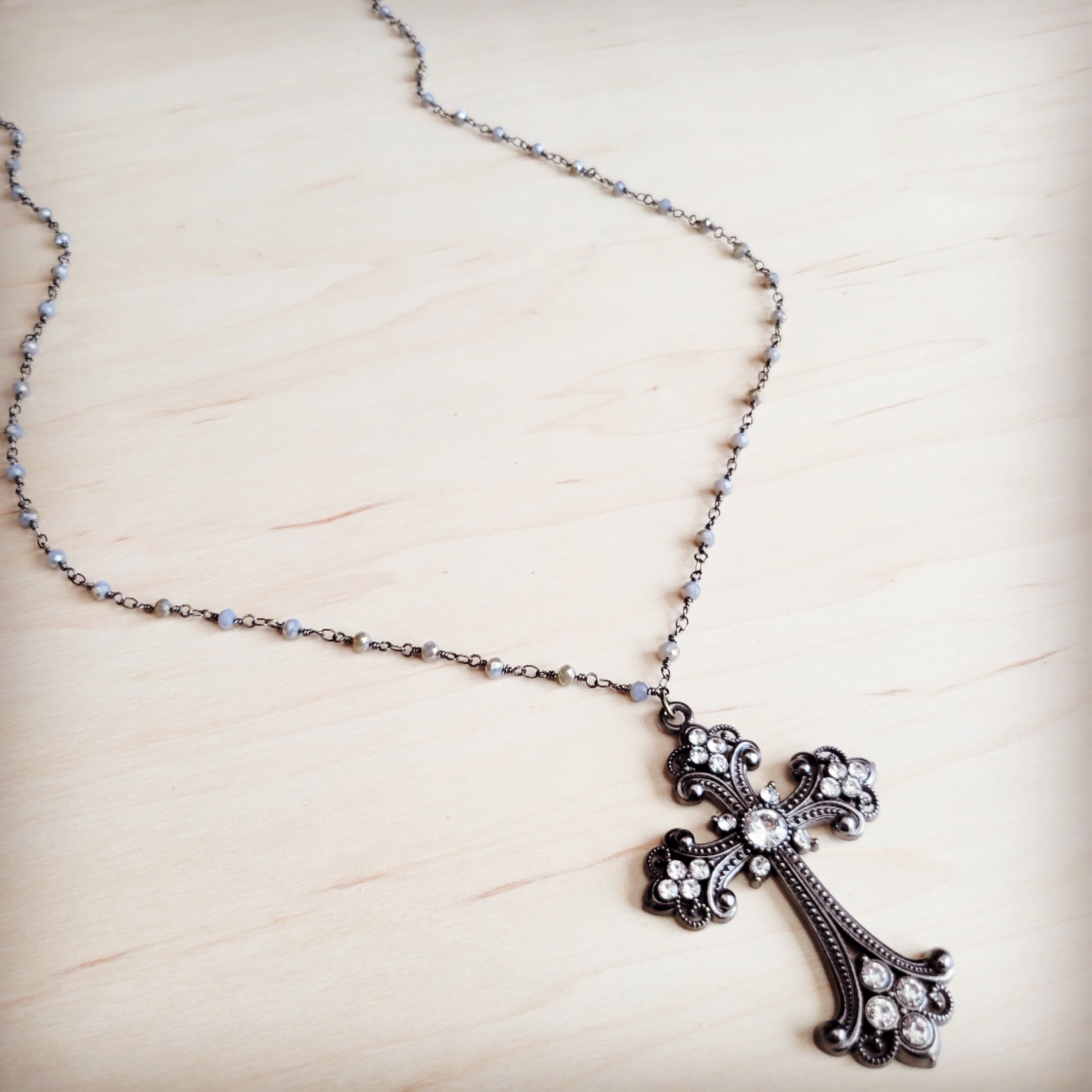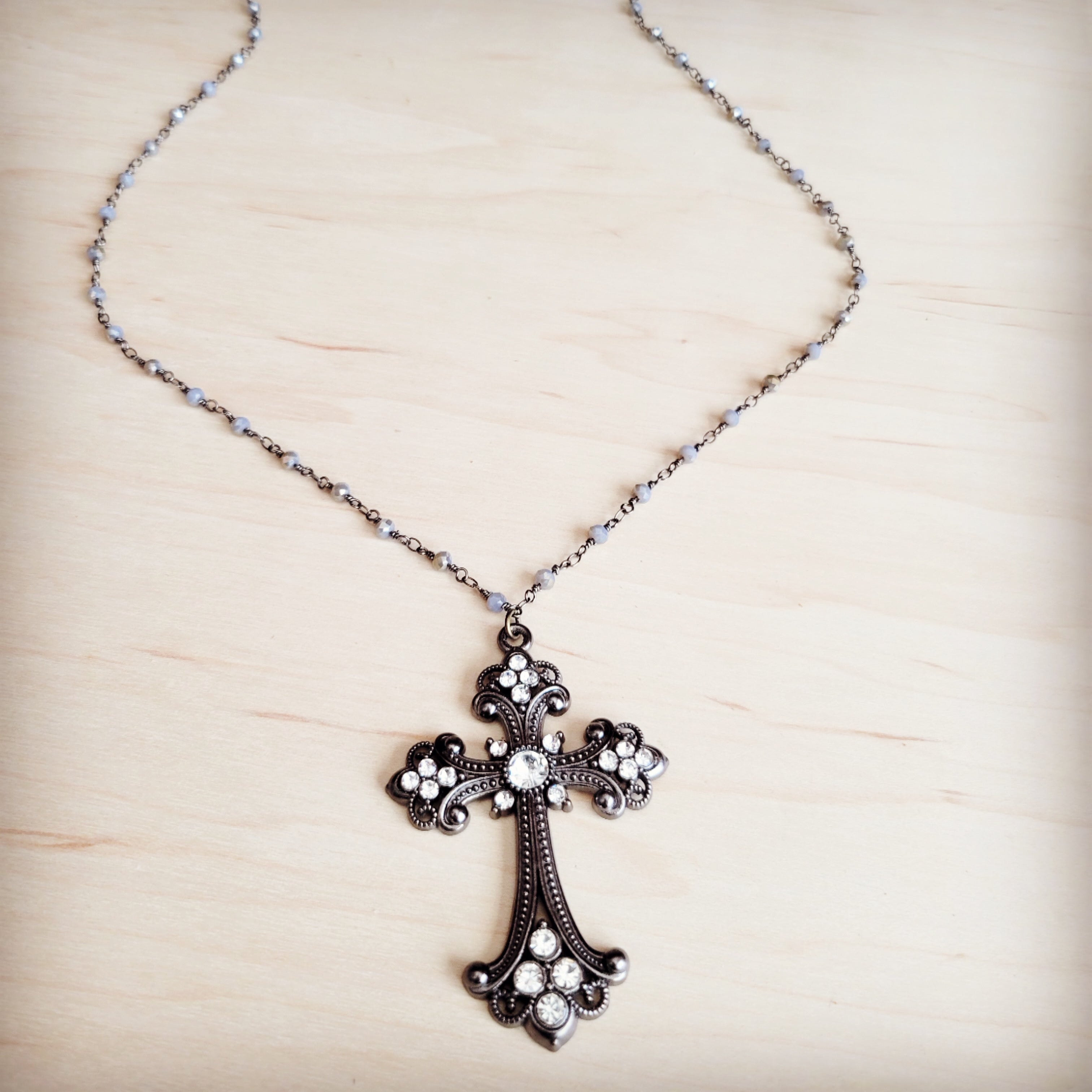 Gray Beaded Necklace w/ Gunmetal Cross Pendant 257kb