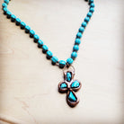 Expertly handcrafted, this boho necklace features a stunning combination of blue turquoise melon beads and a stunning soldered copper cross. The perfect statement piece, this necklace exudes a unique charm. Elevate any outfit with this one-of-a-kind necklace.