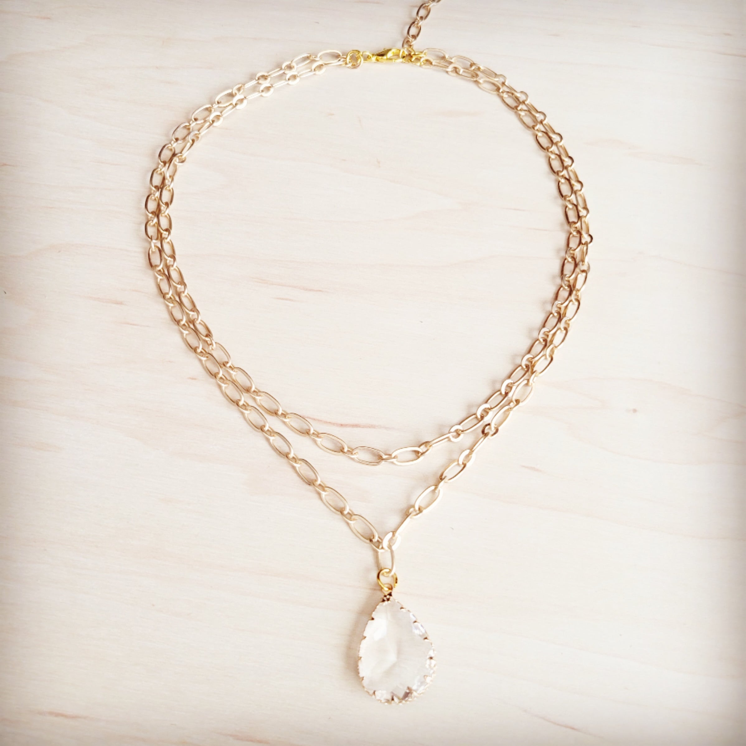 Indulge in the sophisticated charm of this gold chain necklace, featuring unique, shimmering oval links that catch the light beautifully. The chain gracefully suspends a magnificent, faceted clear teardrop pendant rimmed in gold. This piece embodies elegant boho chic, offering a touch of indulgence that is great for elevating every outfit.