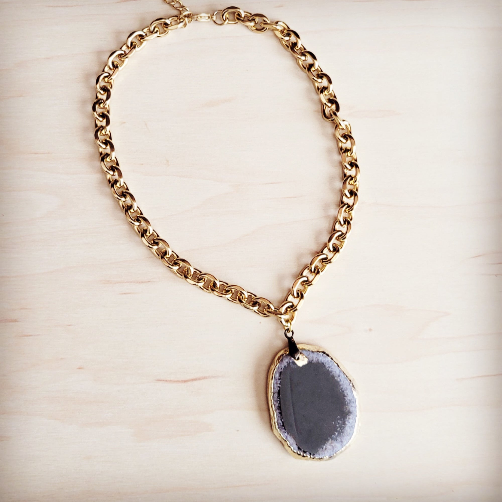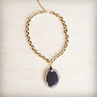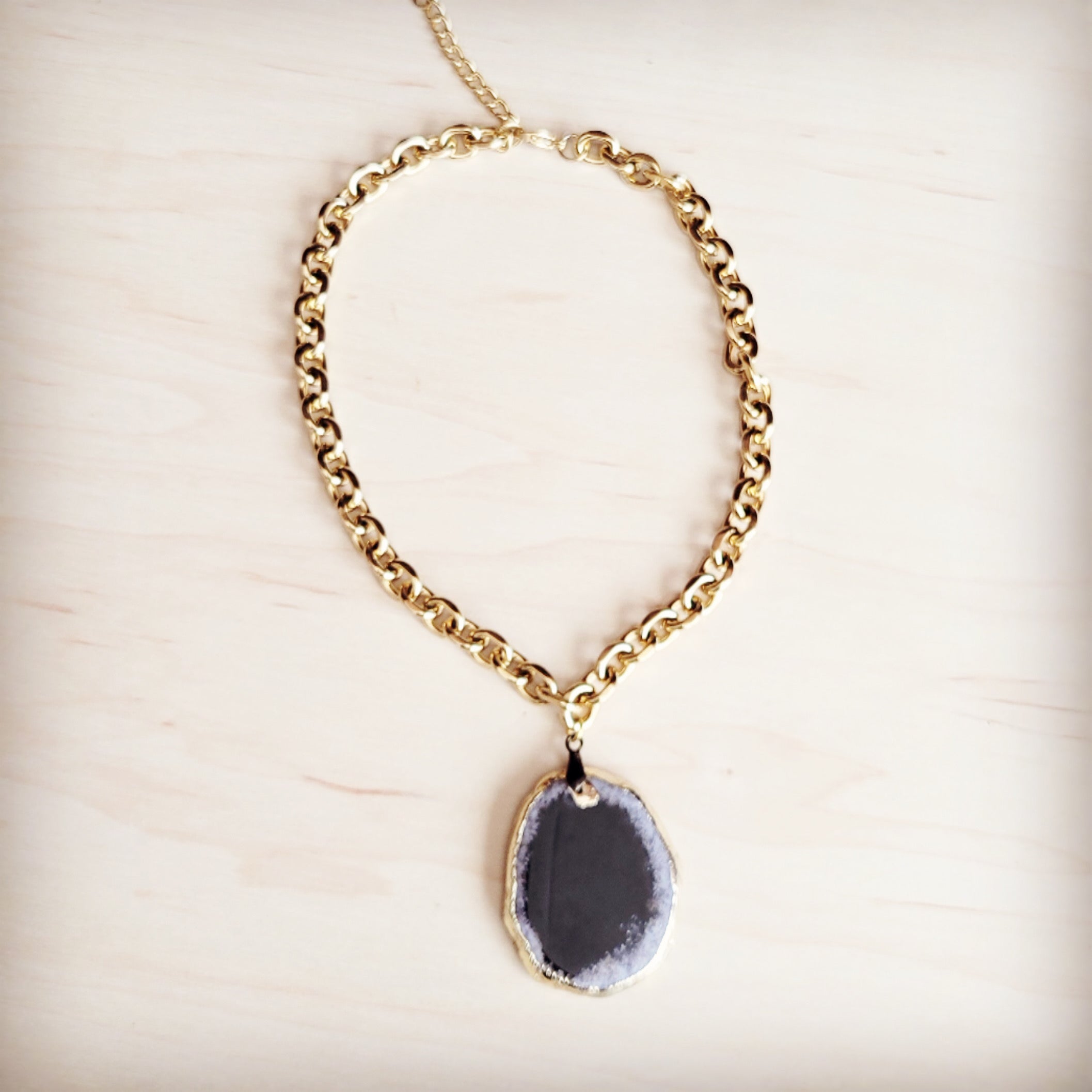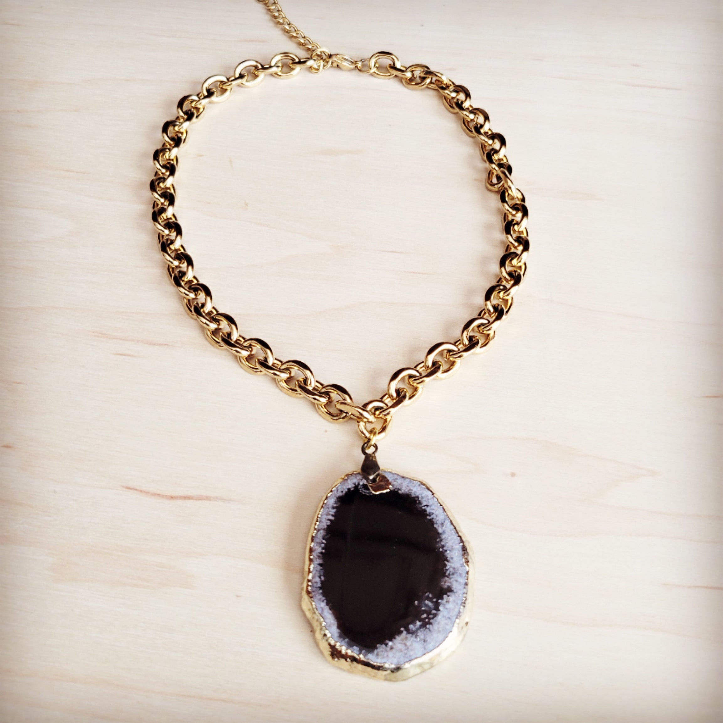 This striking, short-length elegant chic boho style necklace features a sophisticated heavy gold-tone chain that showcases a beautiful, polished Agate slice pendant. With its rich, dark color rimmed in gold, this piece is the epitome of modern elegance. Designed as a statement layering chain necklace, it's the perfect anchor to elevate any outfit from casual to captivating.