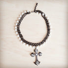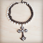This bold choker necklace features a striking contrast of luminous white pearls and dark, textured gunmetal chains. It suspends a dramatic filigree cross pendant richly detailed with sparkling clear stones. Its sophisticated blend of rugged chain and classic elegance makes it the perfect statement piece to instantly elevate any Western or bohemian-inspired ensemble.