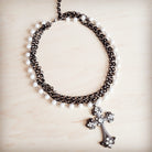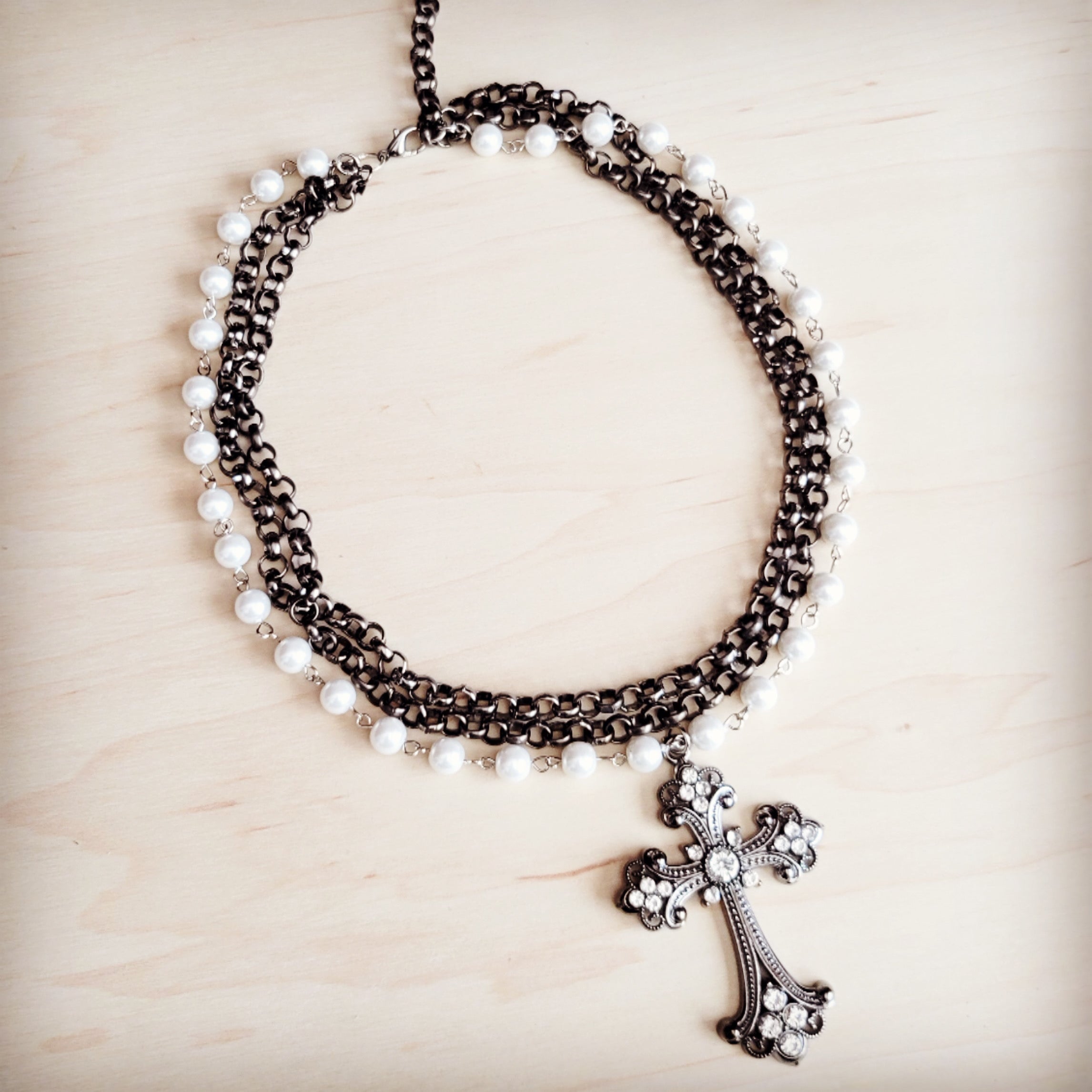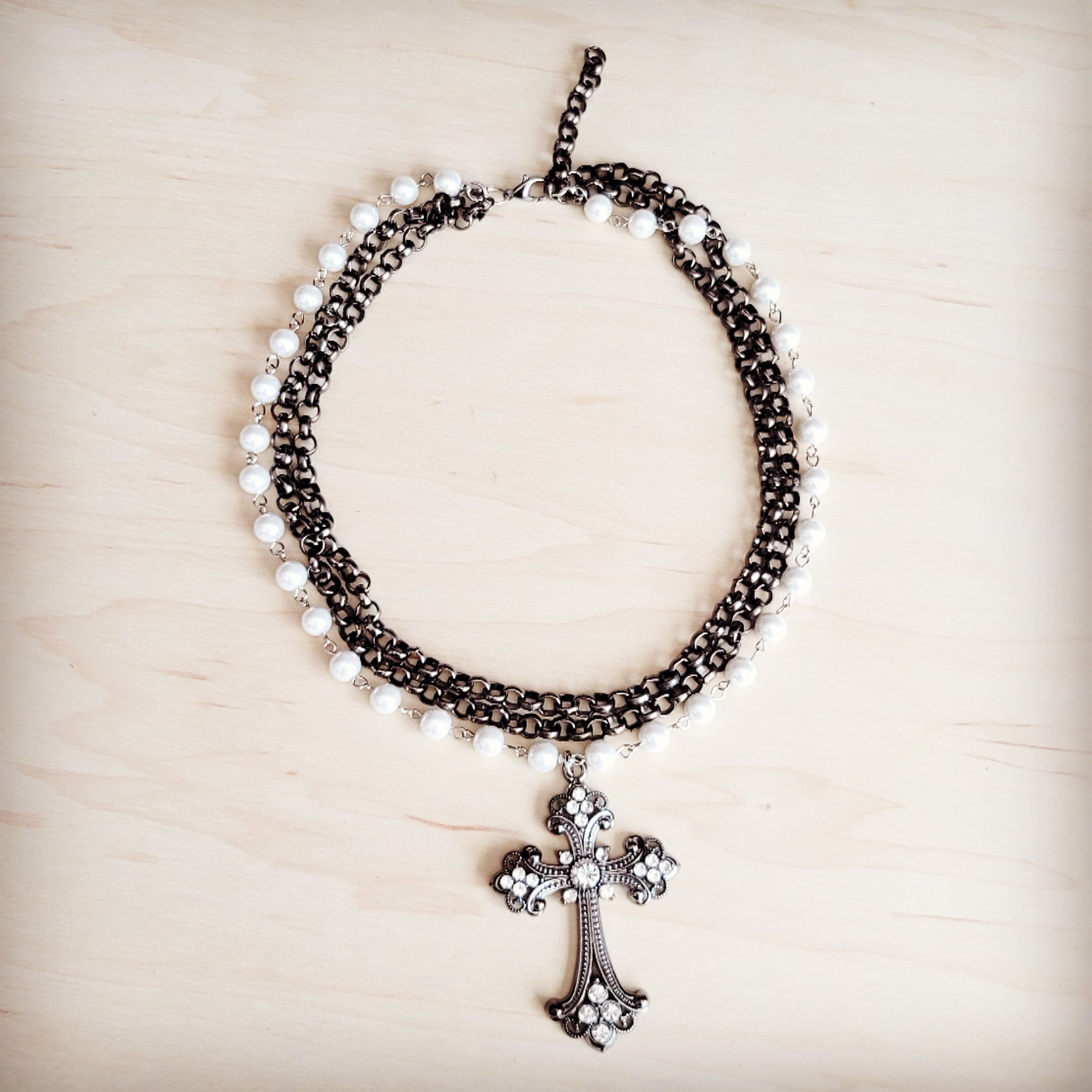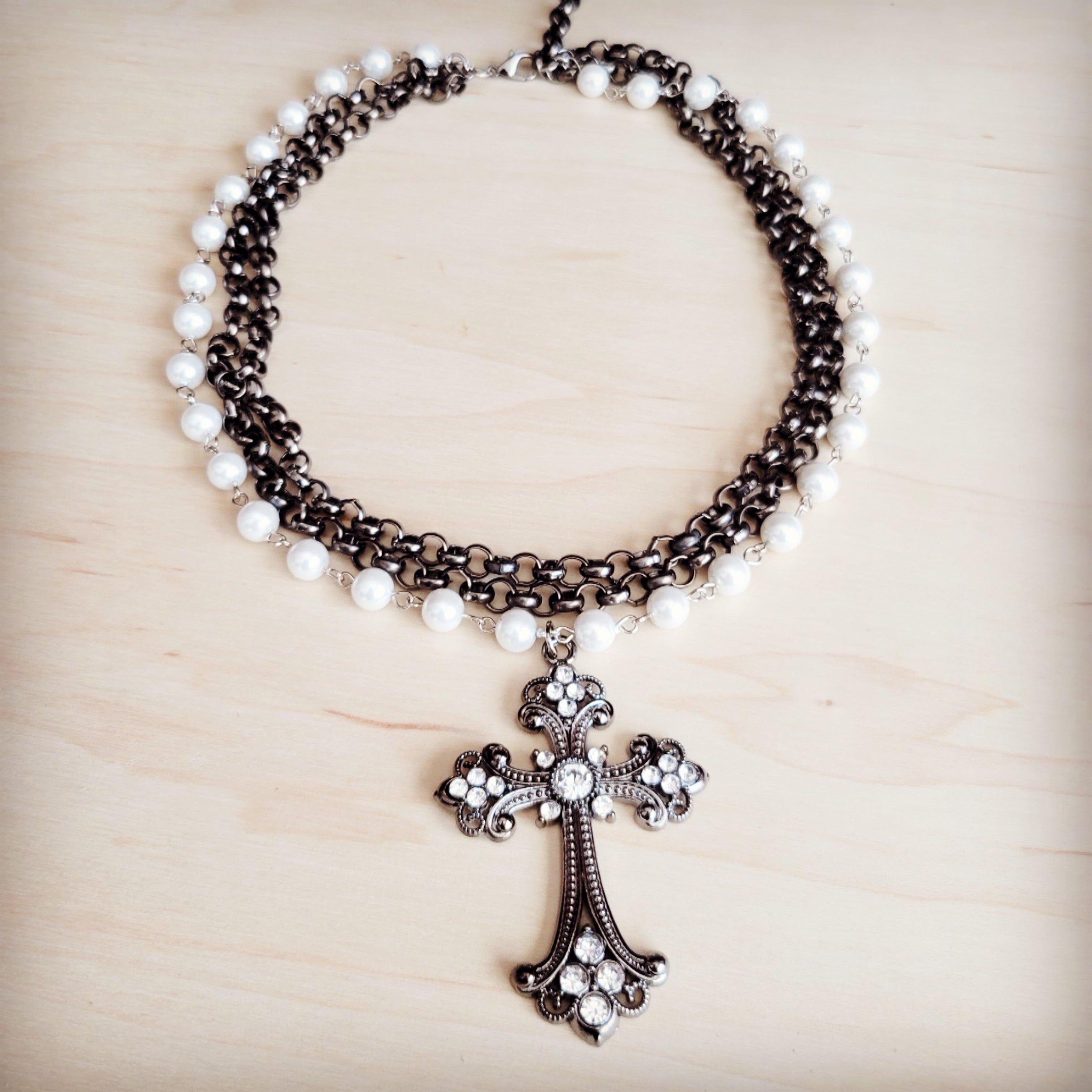 Gunmetal and Pearl Bead Multi-Strand Collar Necklace w/ Cross Pendant 257kw
