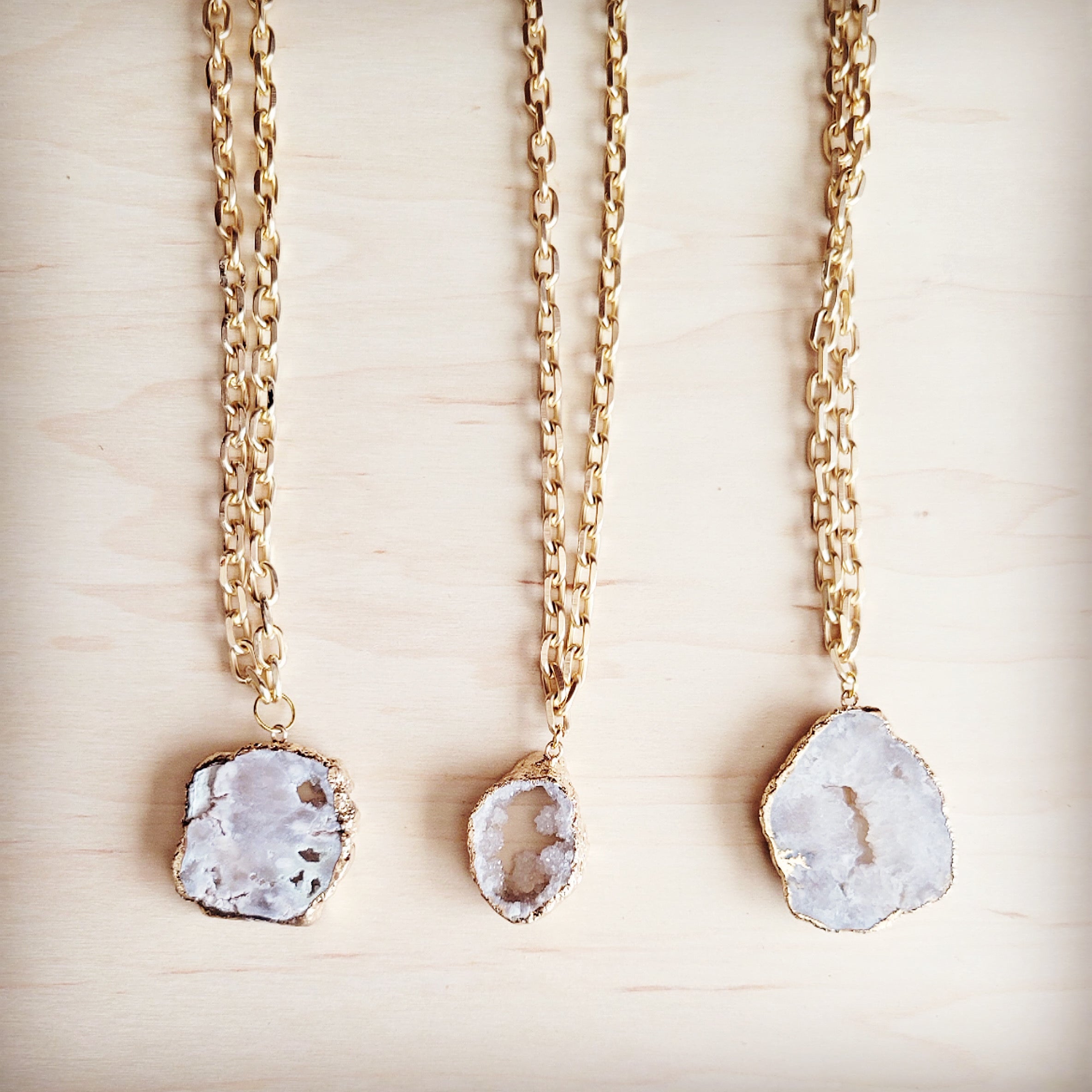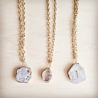 Experience elevated elegance with these stunning boho style gold chain necklaces. Each piece features a unique, polished natural agate slice—showcasing delicate banding and a crystal center—suspended from a sophisticated gold-tone oval link chain. These pieces are the epitome of elegant boho style, offering an effortless touch of natural luxury to any ensemble.