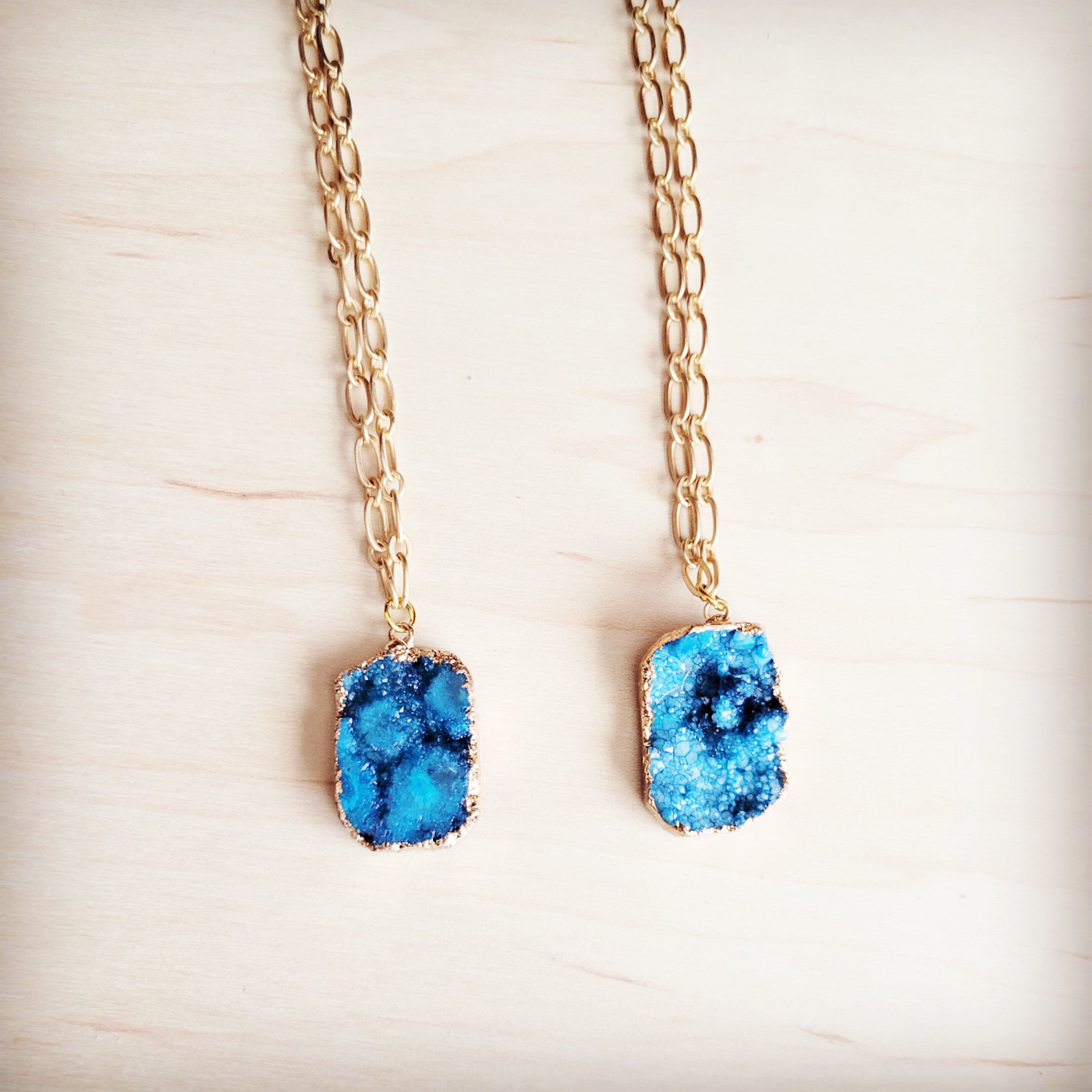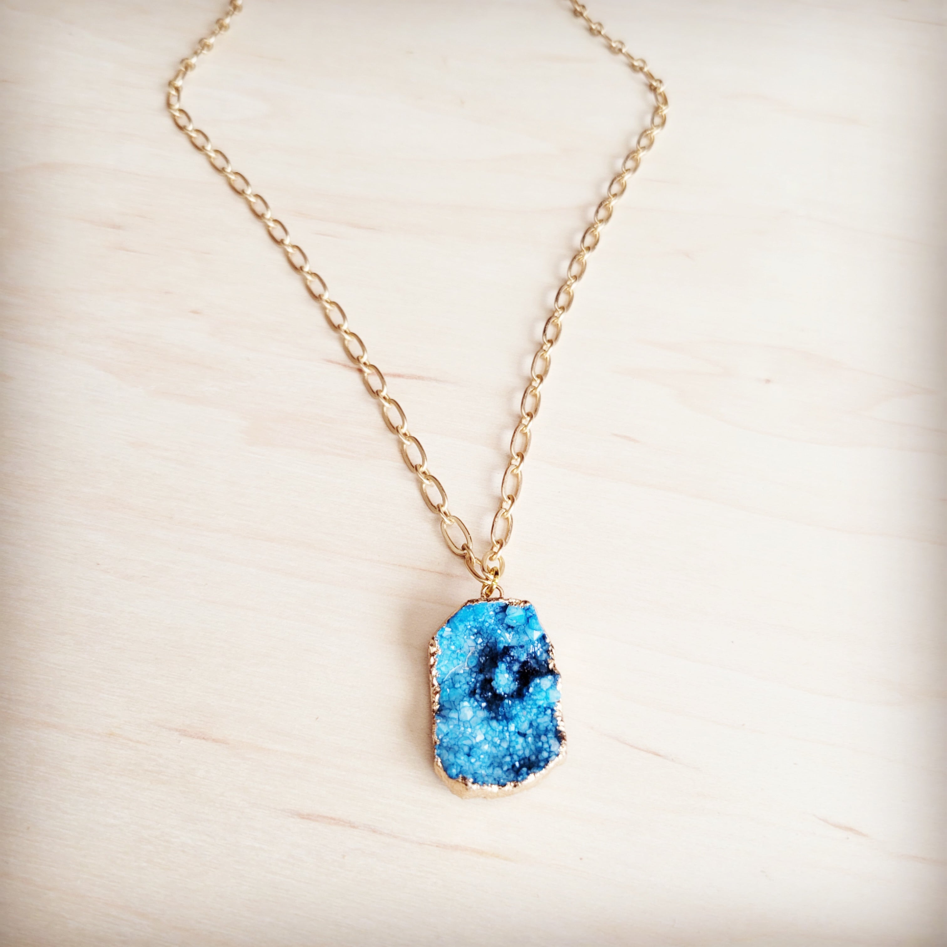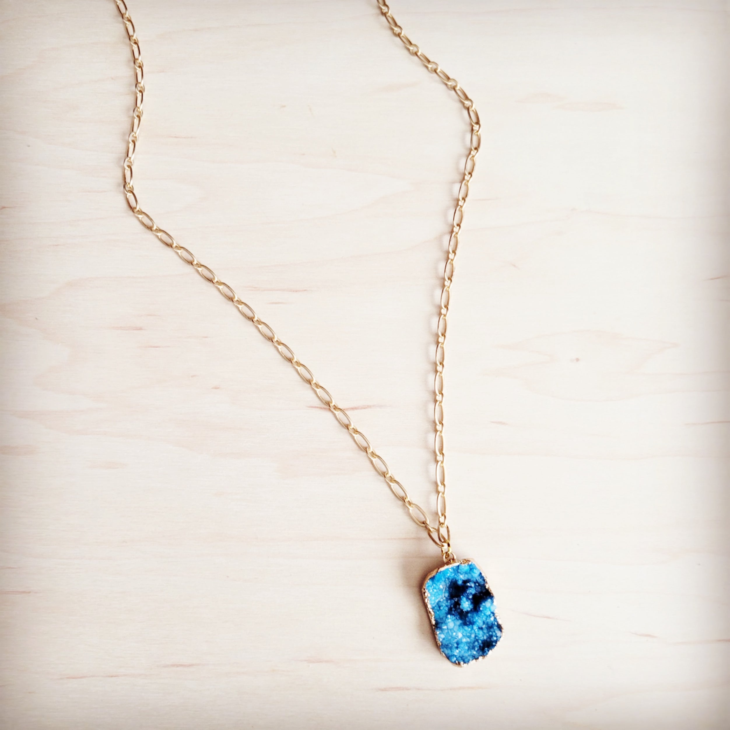 This chic boho style necklace features a thin, long gold chain that drapes elegantly, offering a versatile, effortless look with no clasp closure. The chain perfectly showcases a brilliant, bright shiny blue pendant with a natural, raw edge. This stunning piece provides an instant pop of color and bohemian elegance to any outfit.