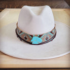 Transform your hat into a statement piece with this hand-crafted genuine leather hat band, showcasing rich leather paired with eye-catching turquoise accents. Expertly made to deliver authentic western flair, this wide band wraps your hat in quality craftsmanship that stands the test of time. Designed as a band-only piece, it's the perfect way to refresh your existing hat collection with genuine style and character